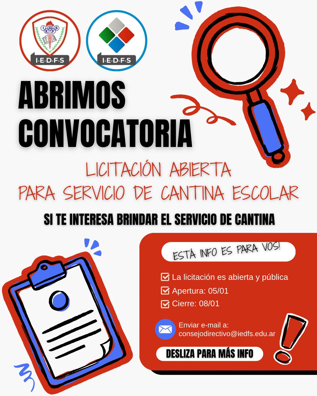 Convocatoria de licitación para Servicio de Cantina Escolar Galería Convocatoria de licitación para Servicio de Cantina Escolar Novedades Convocatoria de licitación para Servicio de Cantina Escolar nivelmedio2026-01-10T00:43:41-03:0010 enero, 2026|Novedades| Más información